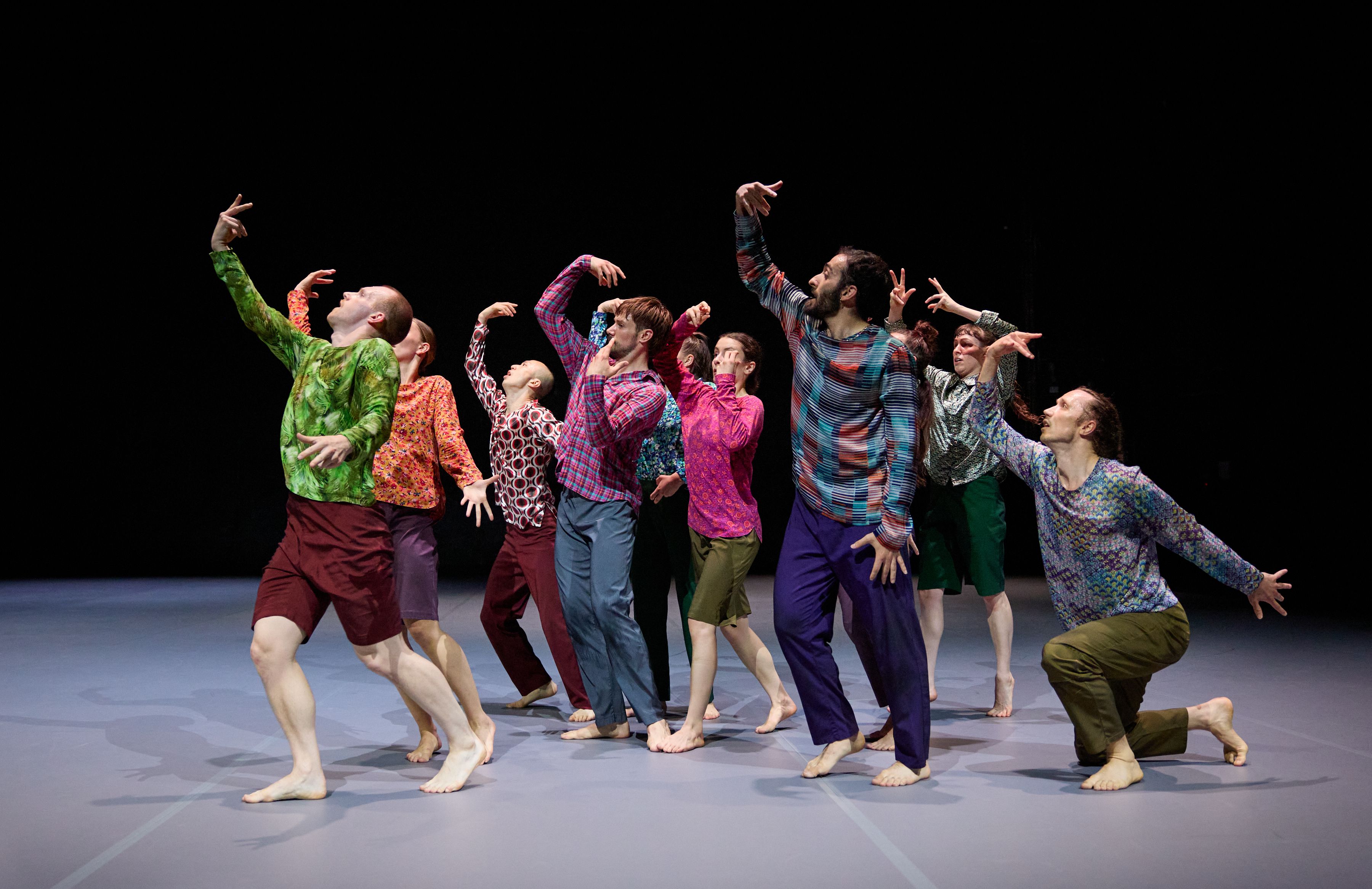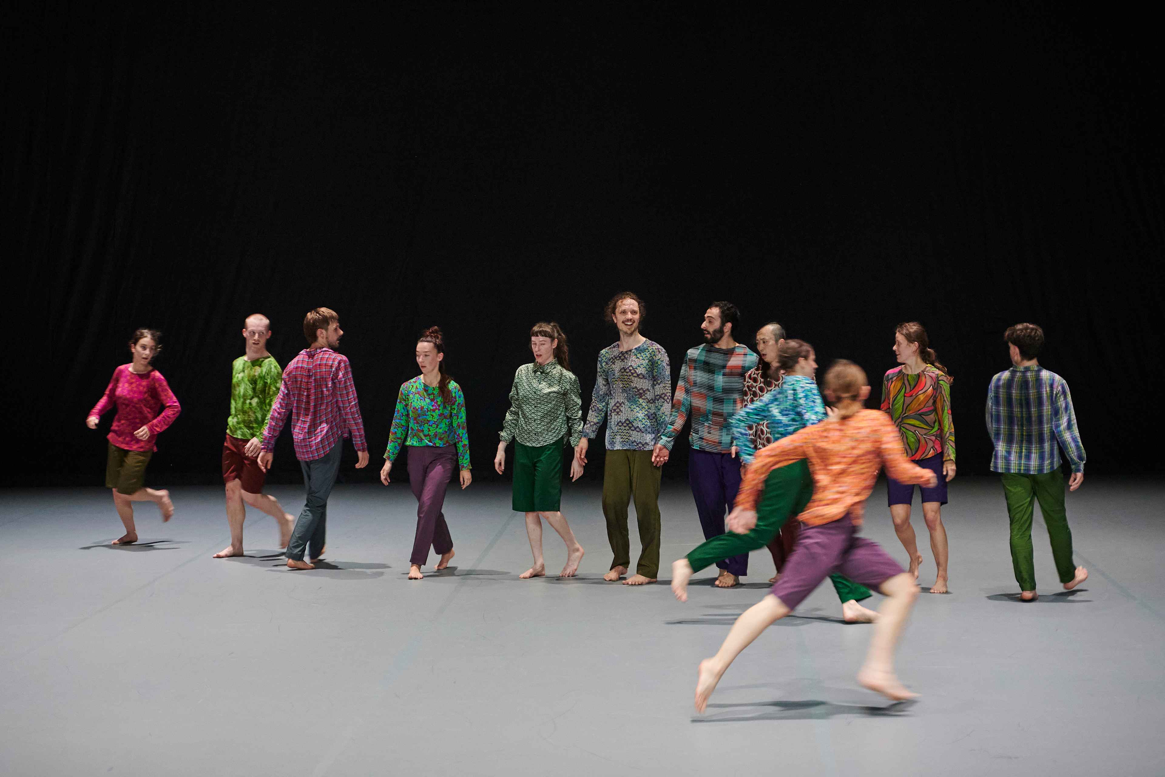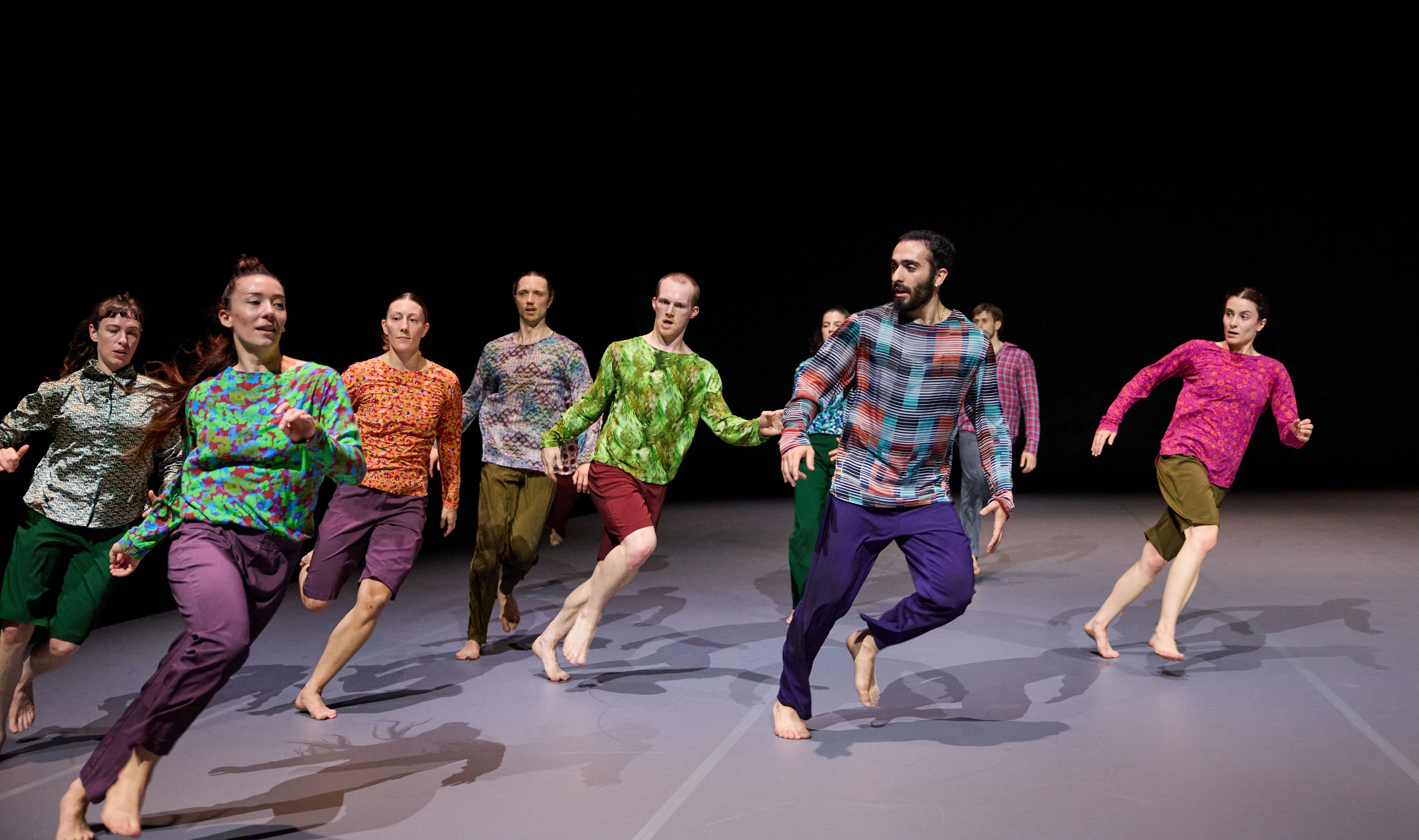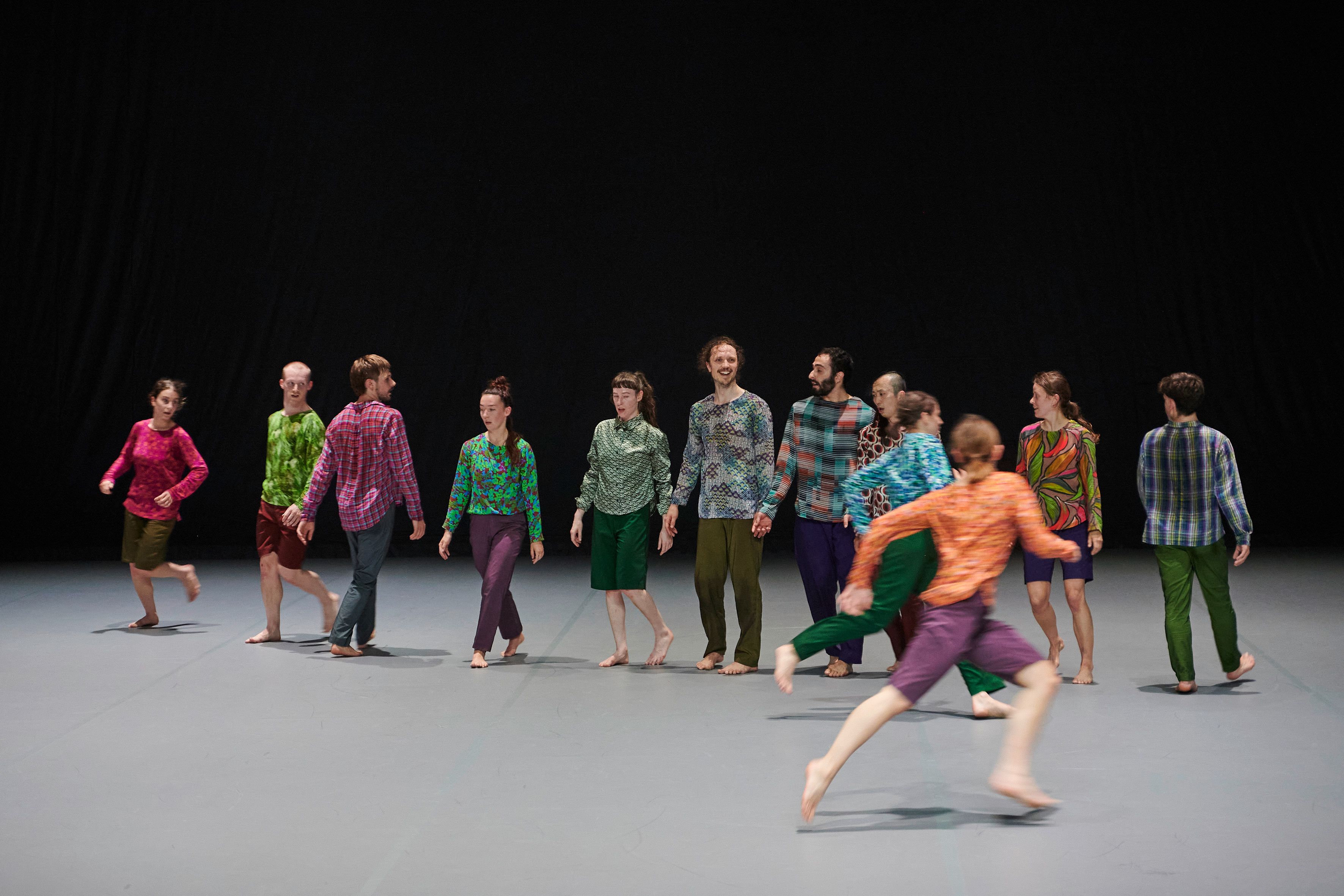 „Wenn die diesmal zwölf Tänzer:innen im Laufen schwärmen, zur Seite, vor, im Rund, und das Rückwärtslaufen emanzipieren, alle achten auf alle und vergemeinschaften den Drall, dann entsteht eine berührende Schönheit. – Melanie Suchy, Die Deutsche Bühne