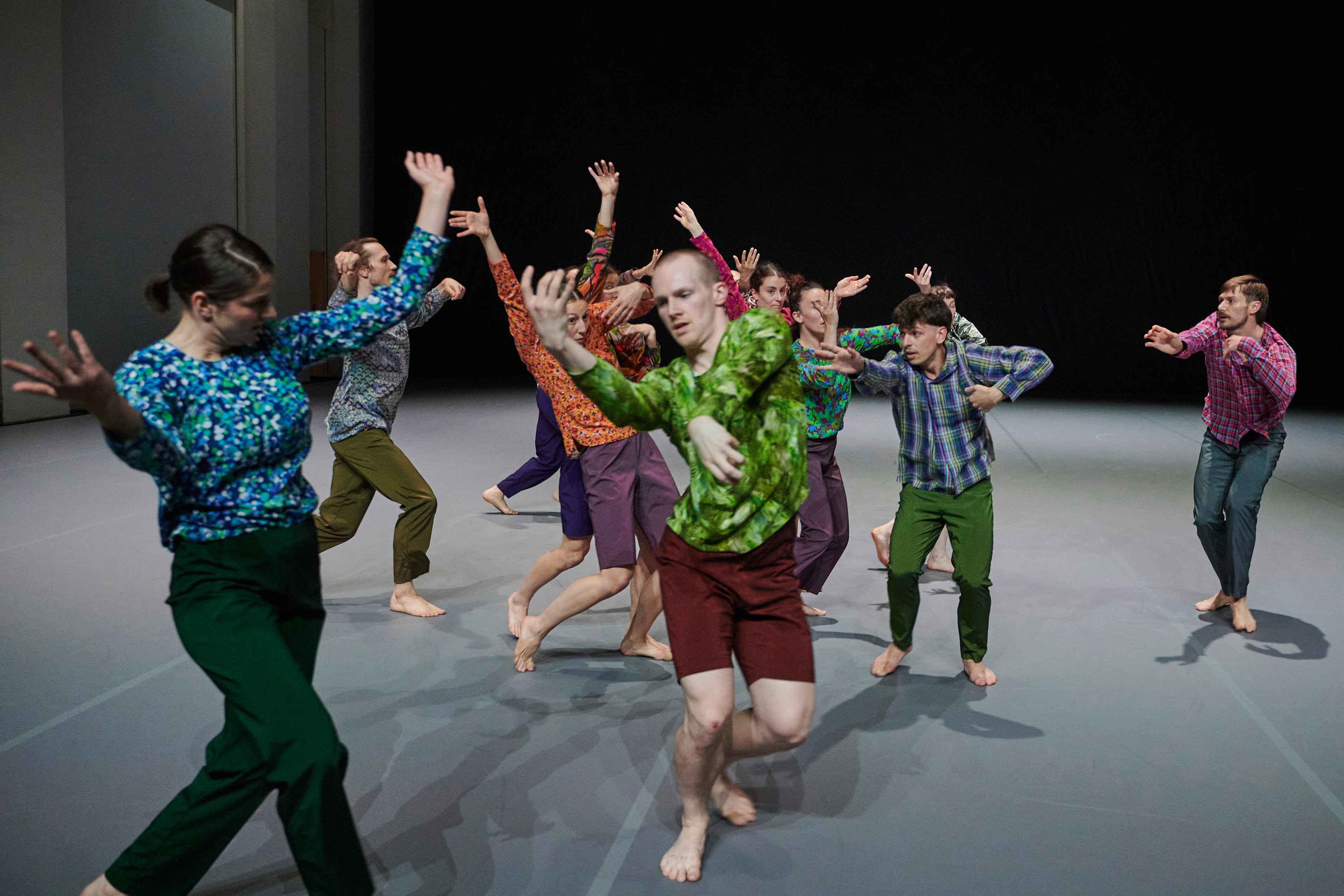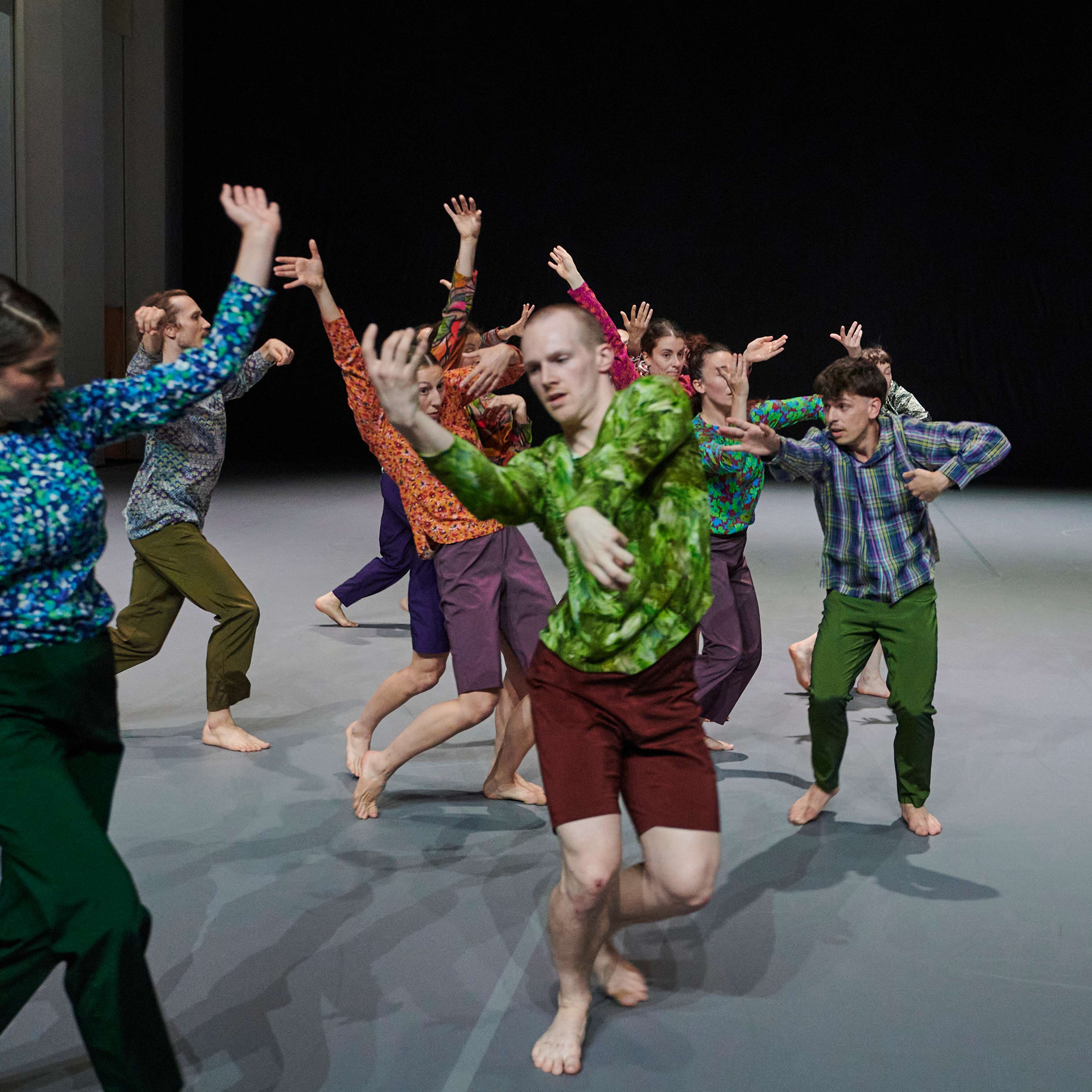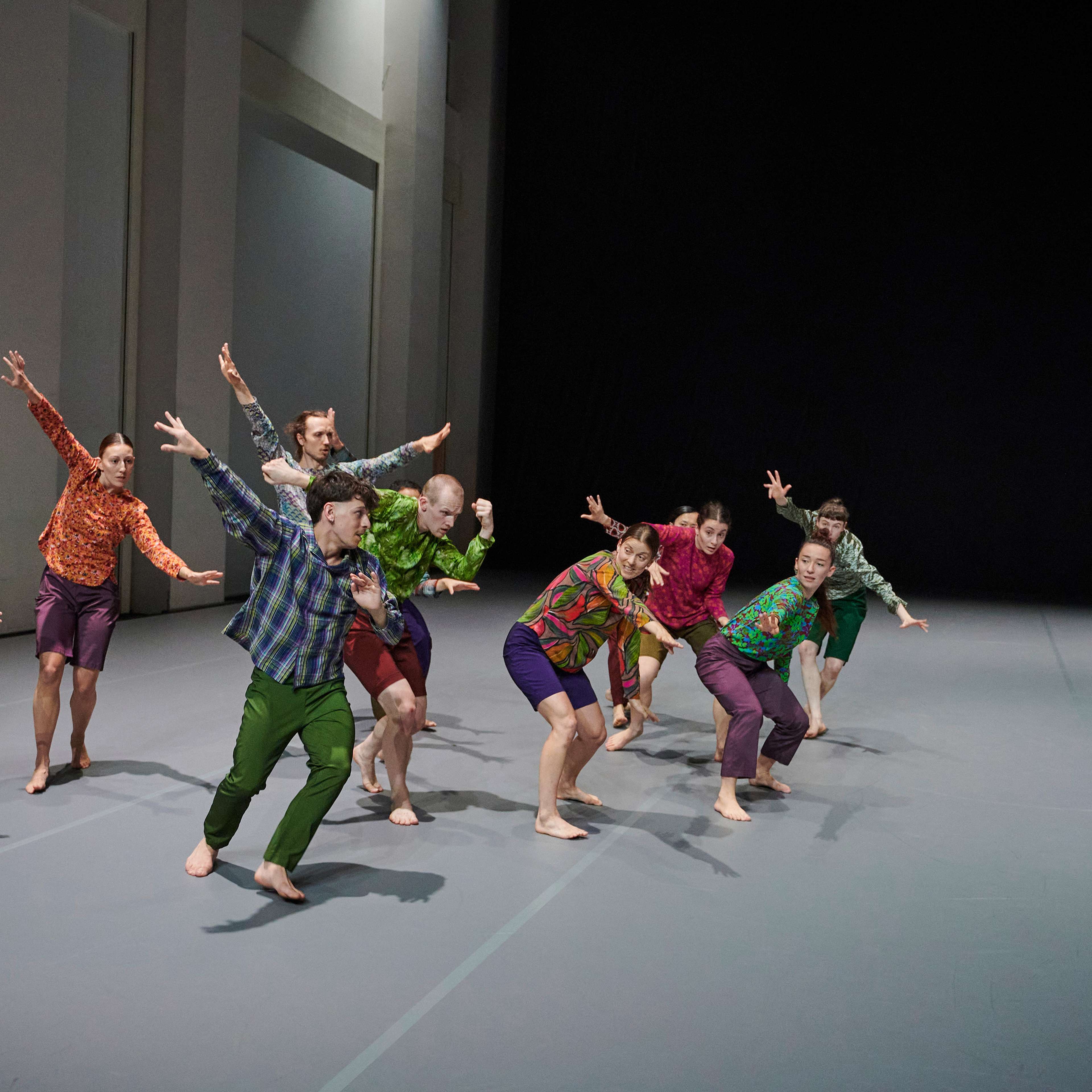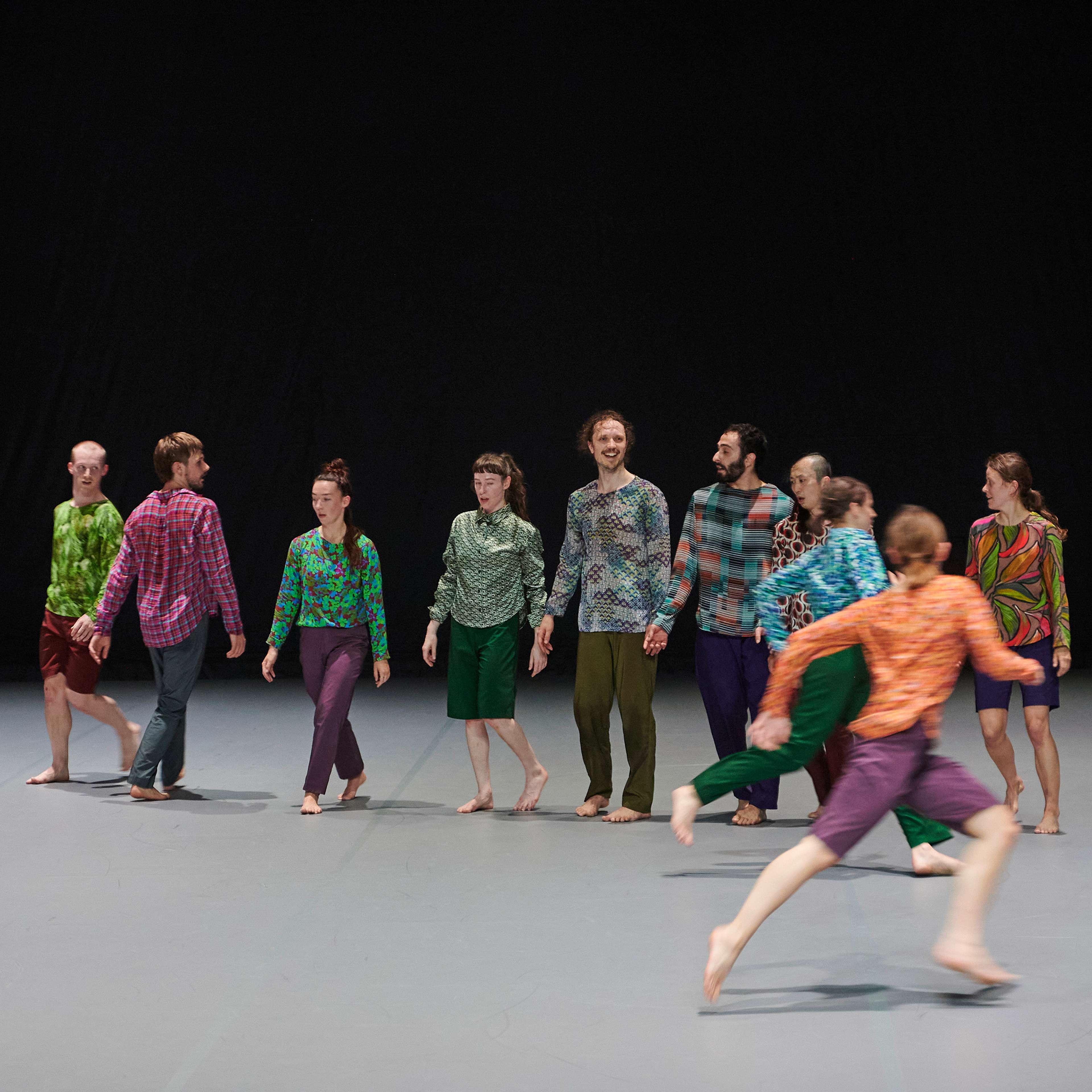 „Wenn die diesmal zwölf Tänzer:innen im Laufen schwärmen, zur Seite, vor, im Rund, und das Rückwärtslaufen emanzipieren, alle achten auf alle und vergemeinschaften den Drall, dann entsteht eine berührende Schönheit. – Melanie Suchy, Die Deutsche Bühne