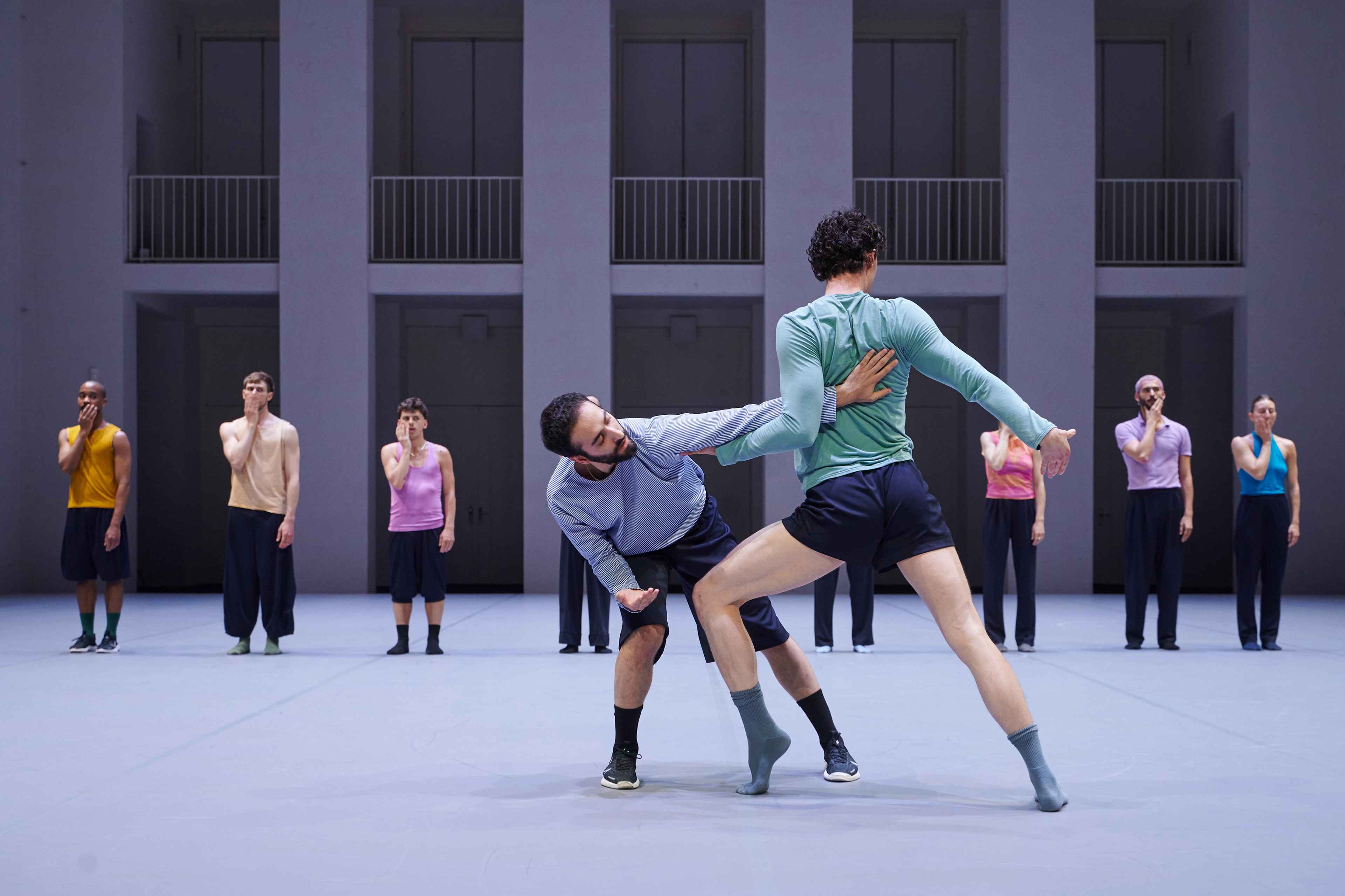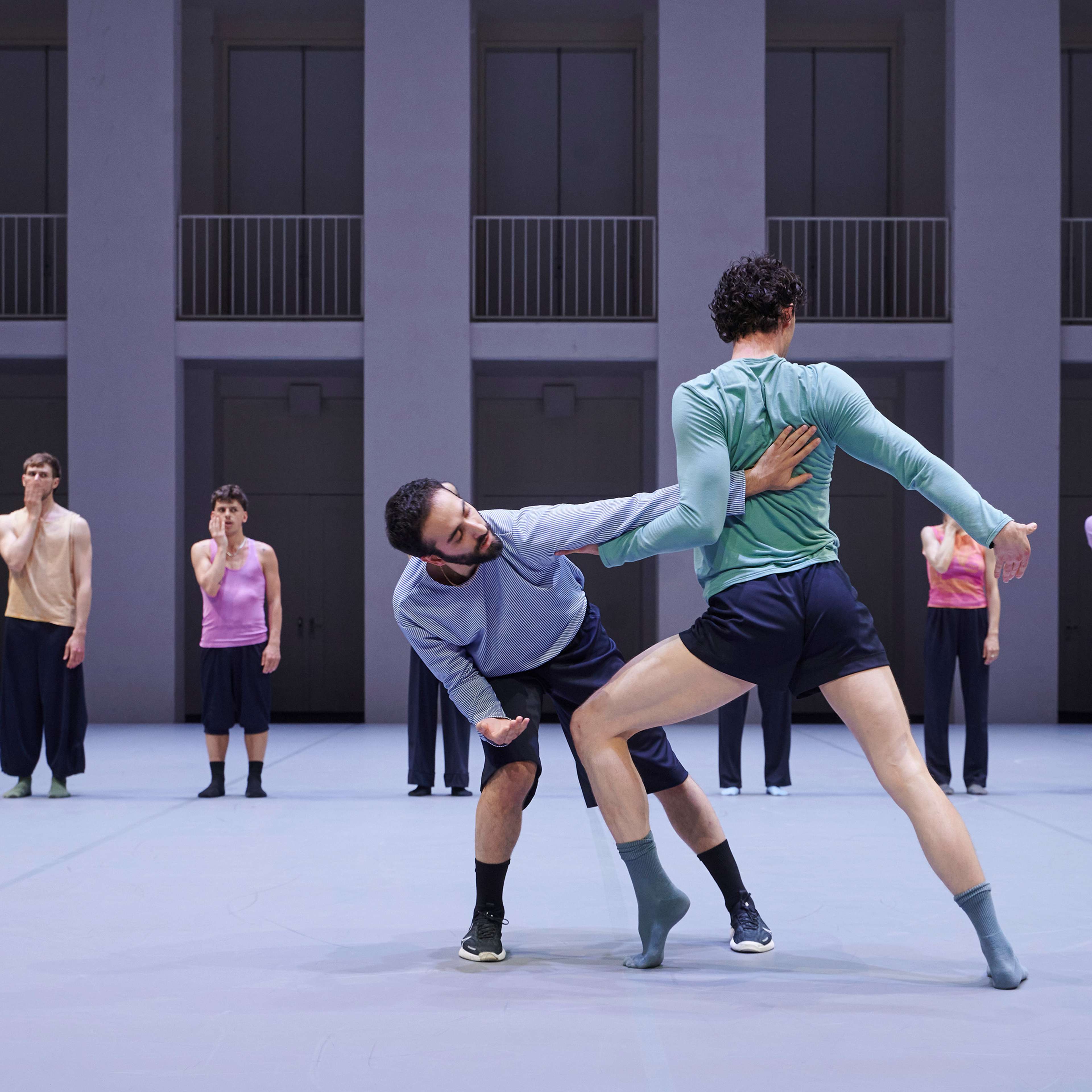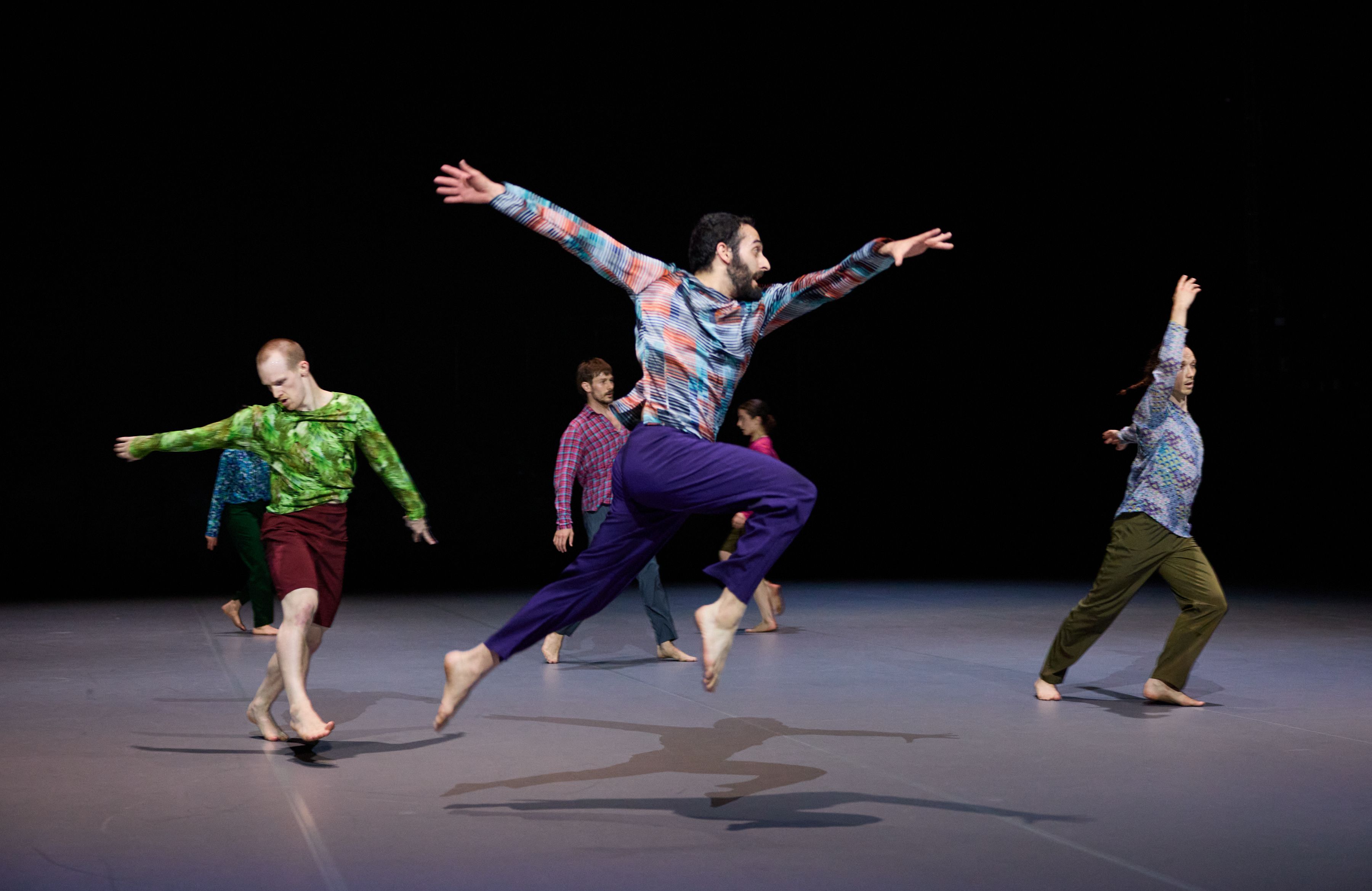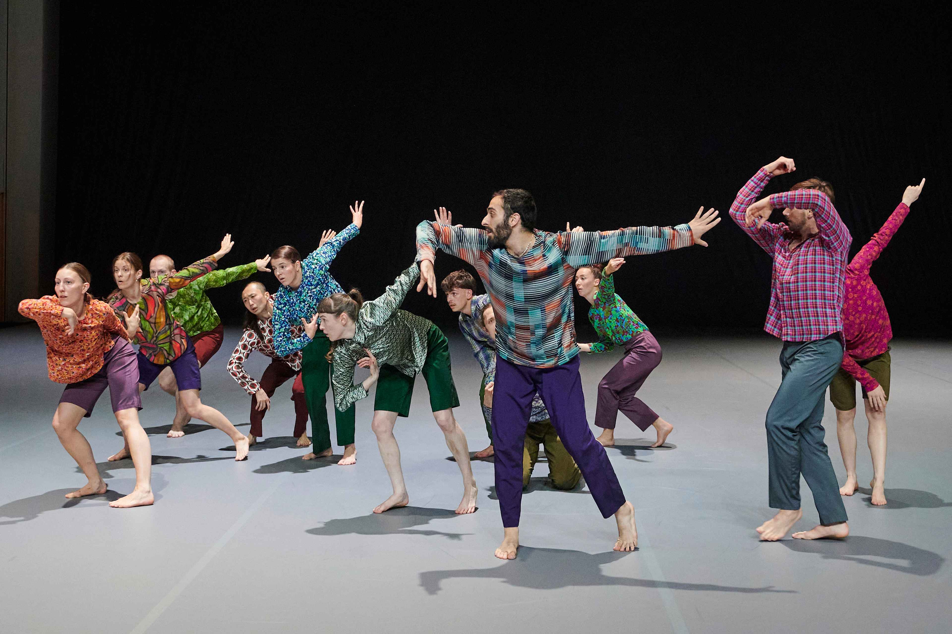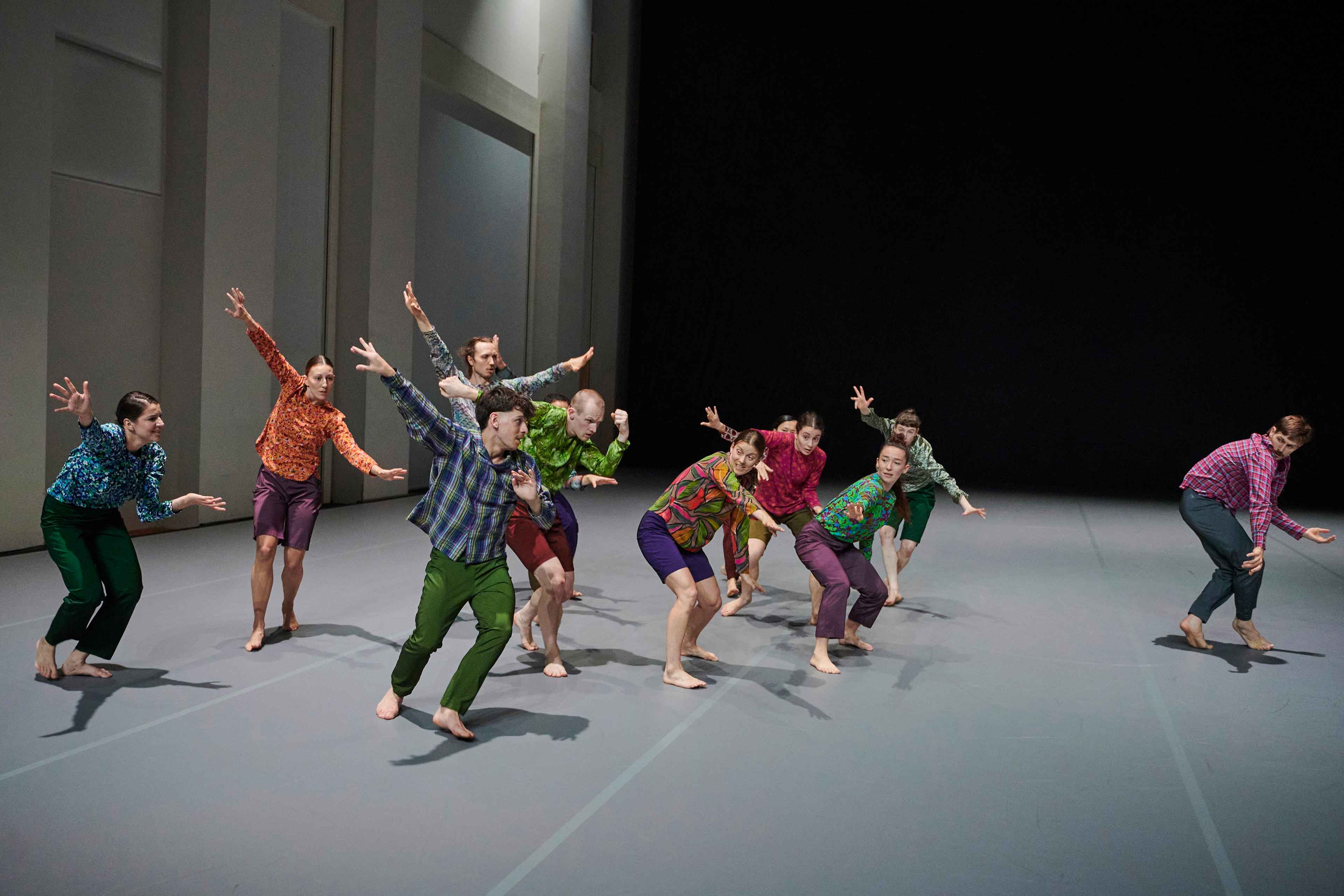 „Wenn die diesmal zwölf Tänzer:innen im Laufen schwärmen, zur Seite, vor, im Rund, und das Rückwärtslaufen emanzipieren, alle achten auf alle und vergemeinschaften den Drall, dann entsteht eine berührende Schönheit. – Melanie Suchy, Die Deutsche Bühne