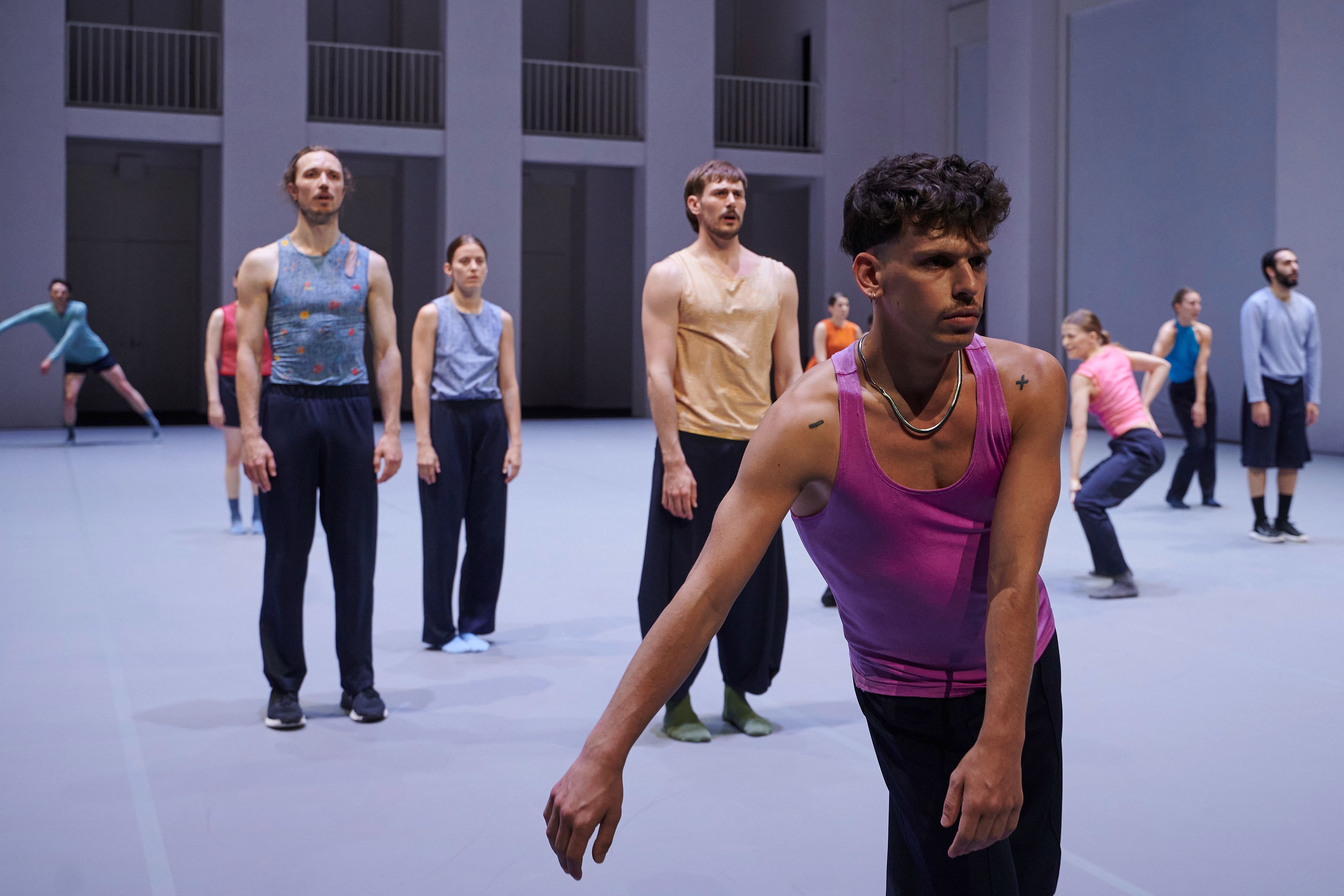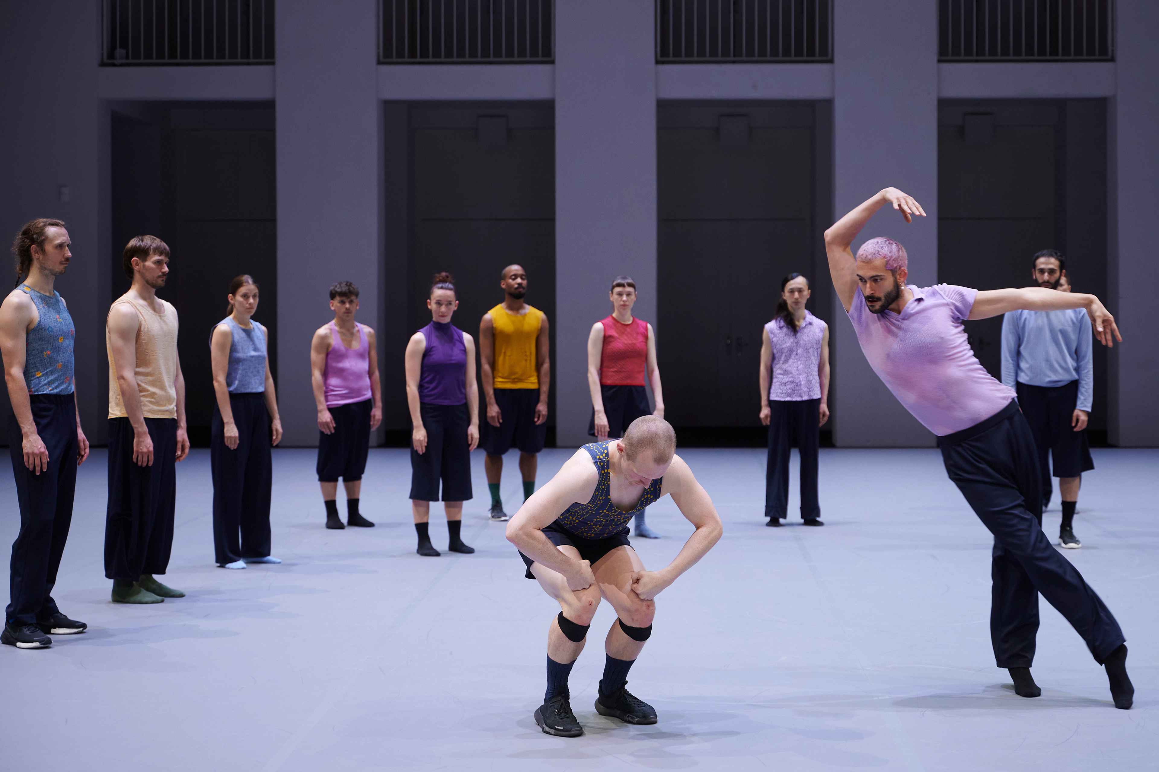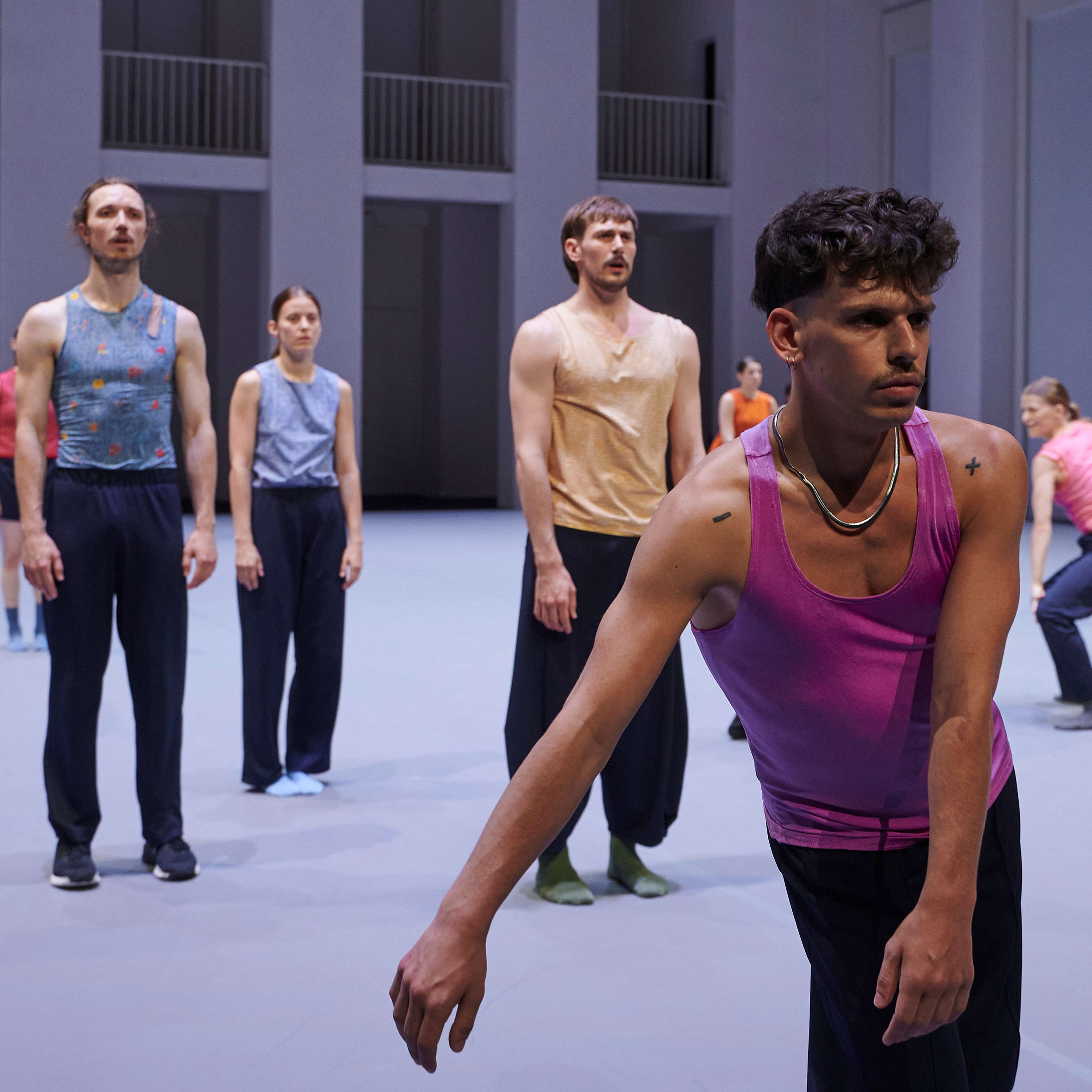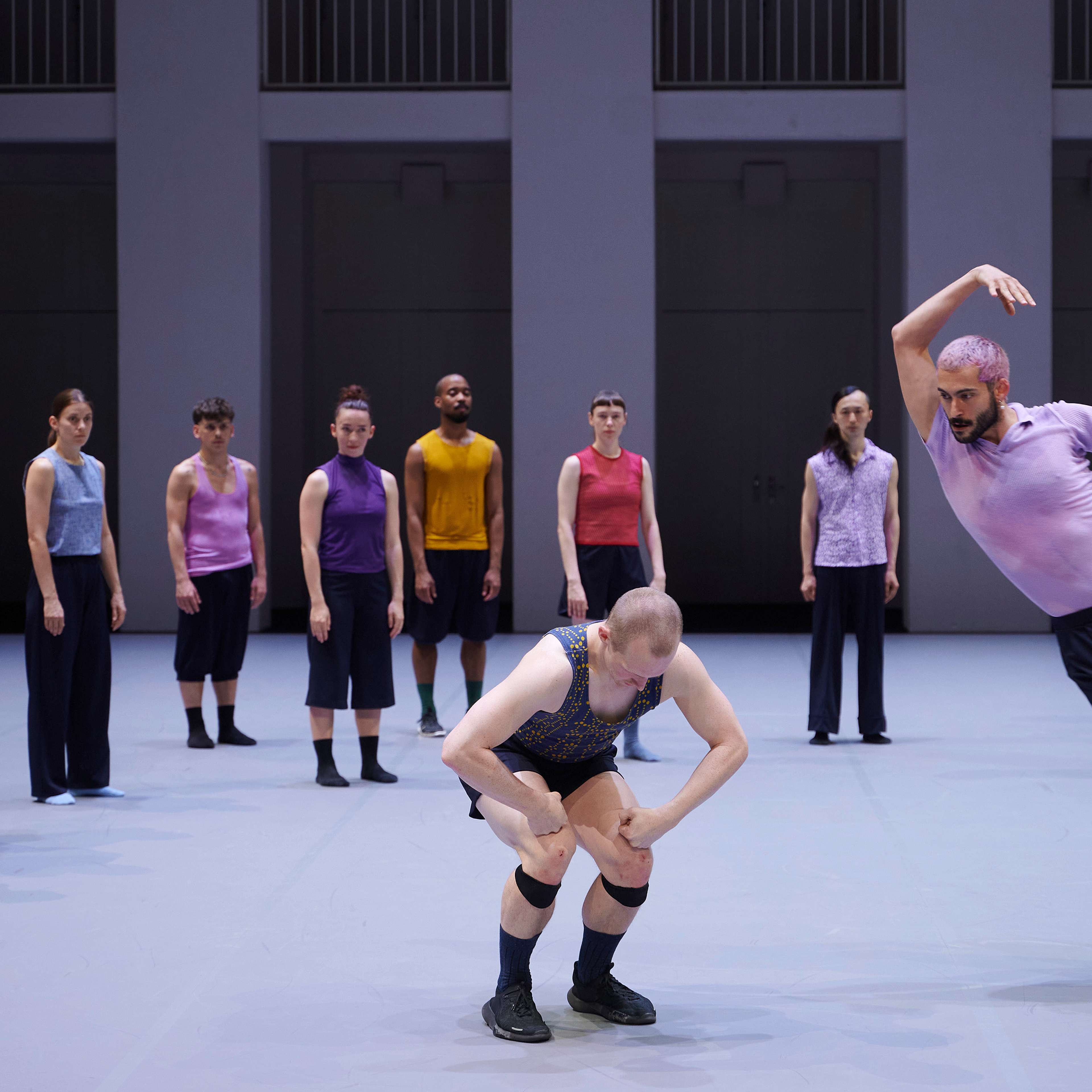 „Wenn die diesmal zwölf Tänzer:innen im Laufen schwärmen, zur Seite, vor, im Rund, und das Rückwärtslaufen emanzipieren, alle achten auf alle und vergemeinschaften den Drall, dann entsteht eine berührende Schönheit. – Melanie Suchy, Die Deutsche Bühne