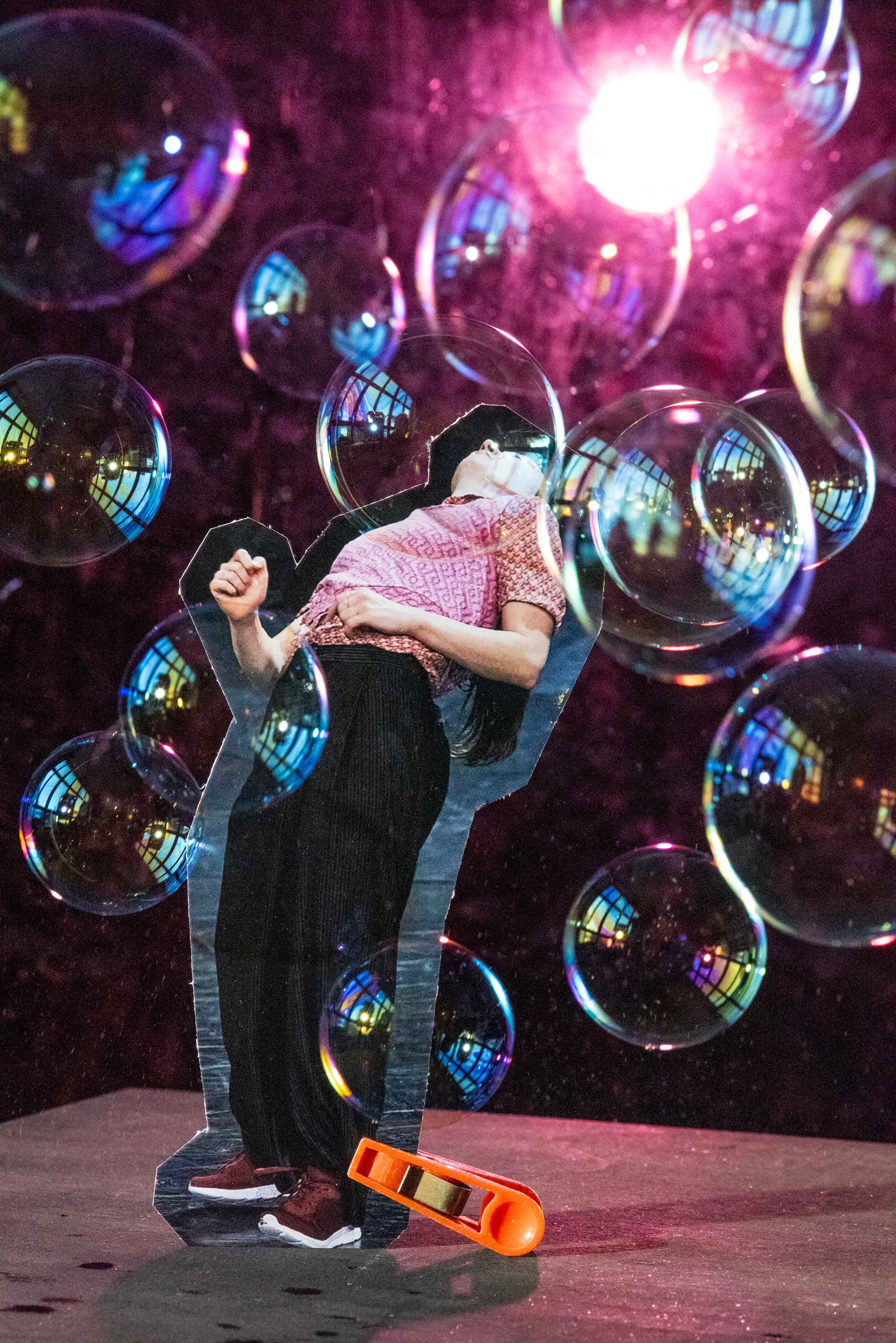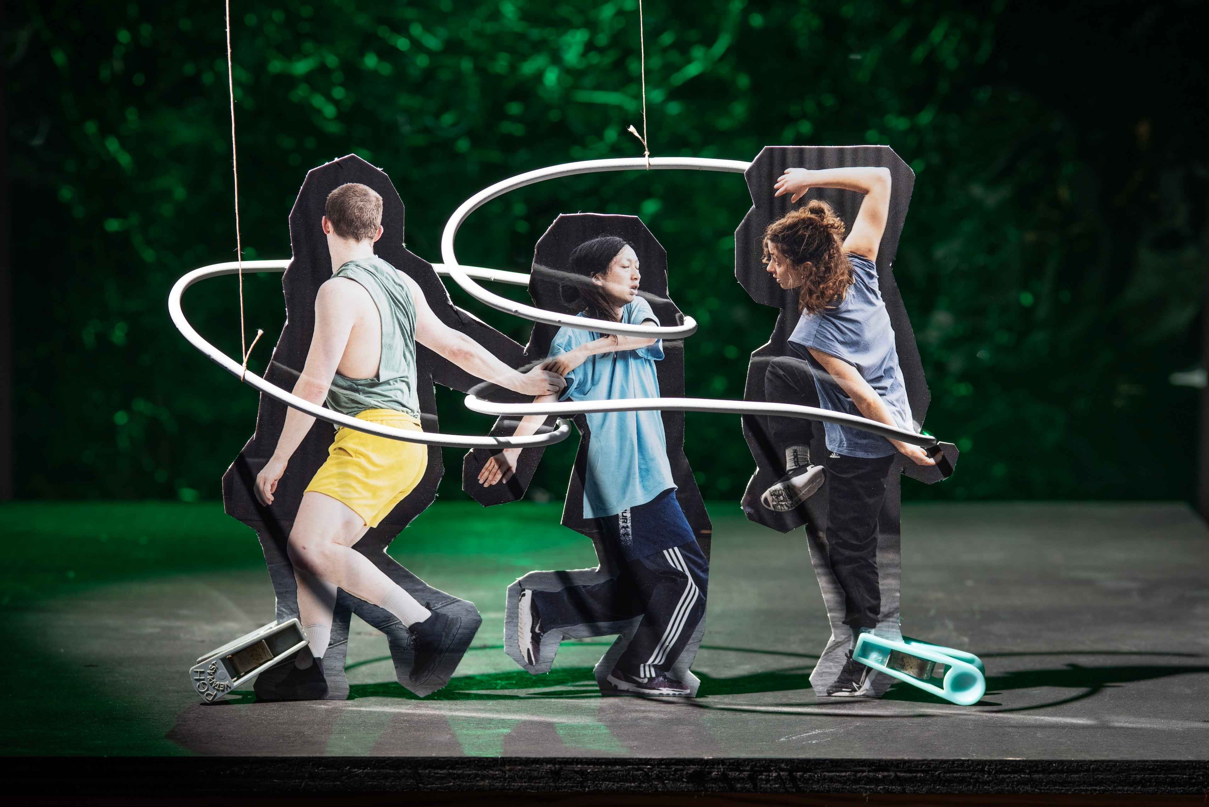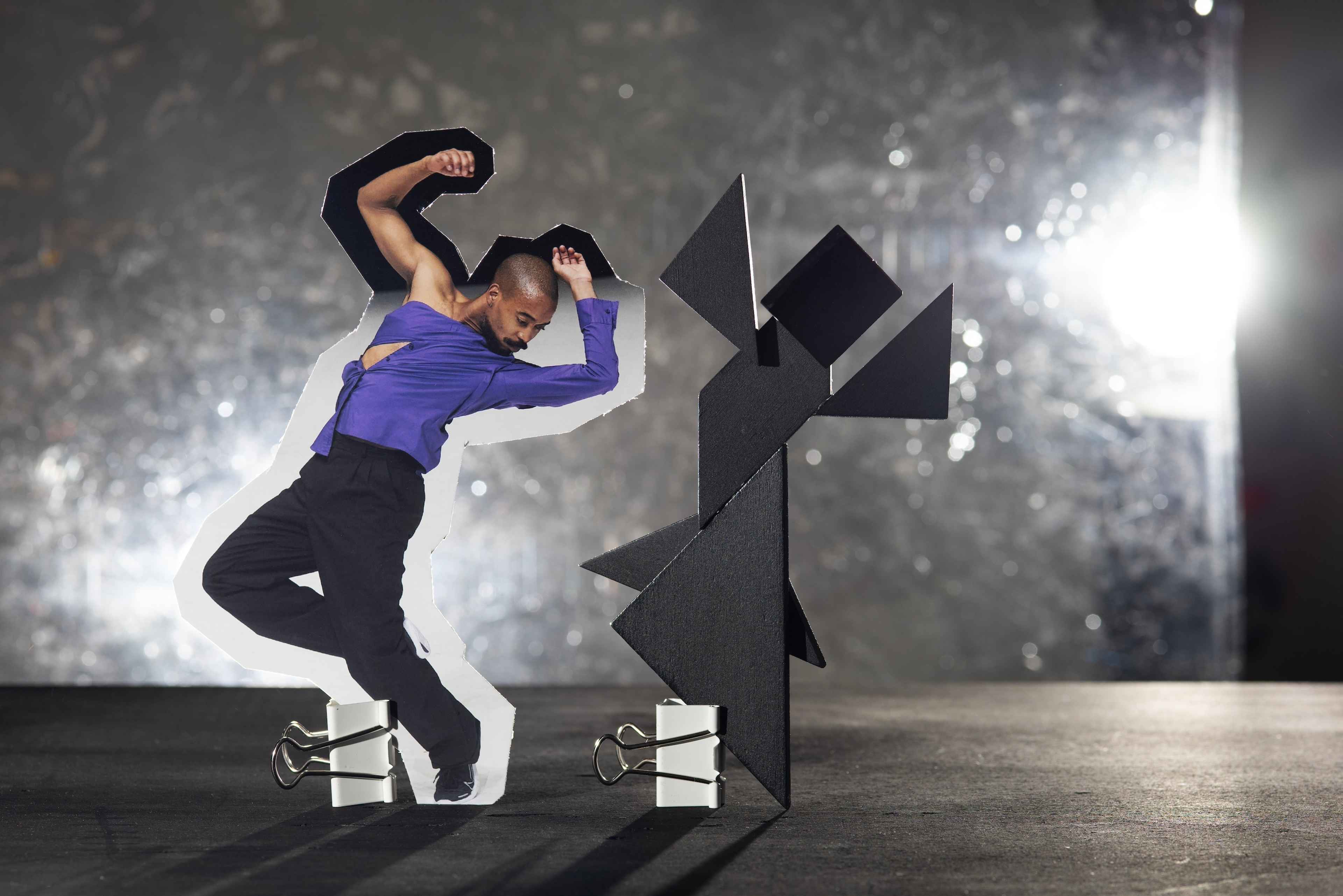 Klar war von Anfang an, dass die Tänzer*innen in die Bildwelt integriert werden sollen. Also habe ich mit Fotos gearbeitet – Fotos im Foto war etwas Neues für mich. Ich habe sie ausgeschnitten, kombiniert und mit Objekten interagieren lassen. Und ich habe viel ausprobiert, wie visuell ein Bühnenraum entstehen könnte, wie sich eine Aufführungssituation andeuten ließe. Dabei war wichtig, dass der Blick zwischen den beiden völlig gegensätzlichen Lesarten oszillieren kann: Sehe ich da gerade kleine Dinge auf einem Tisch oder eine Tänzerin auf einer Bühne? Modell oder Illusion?