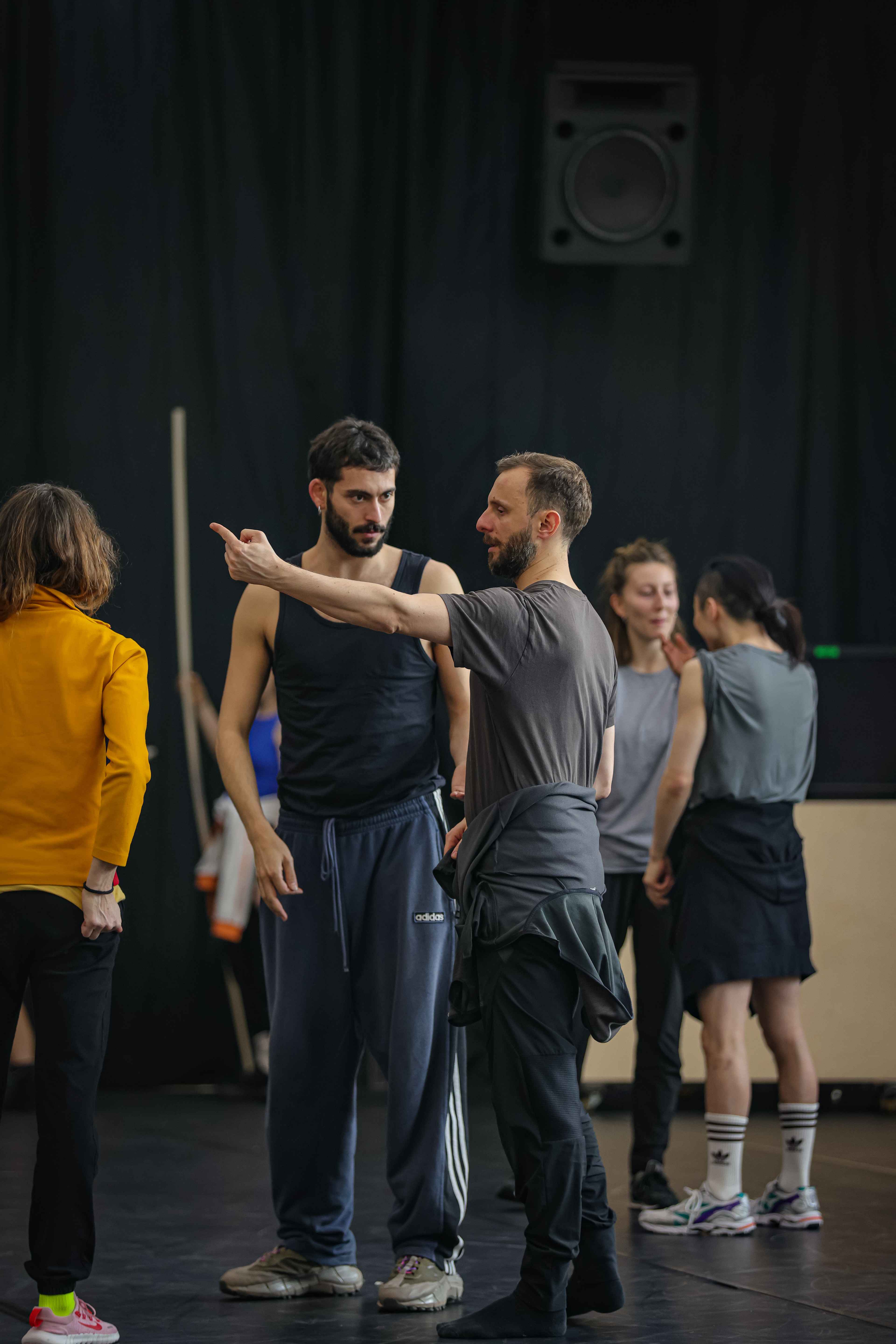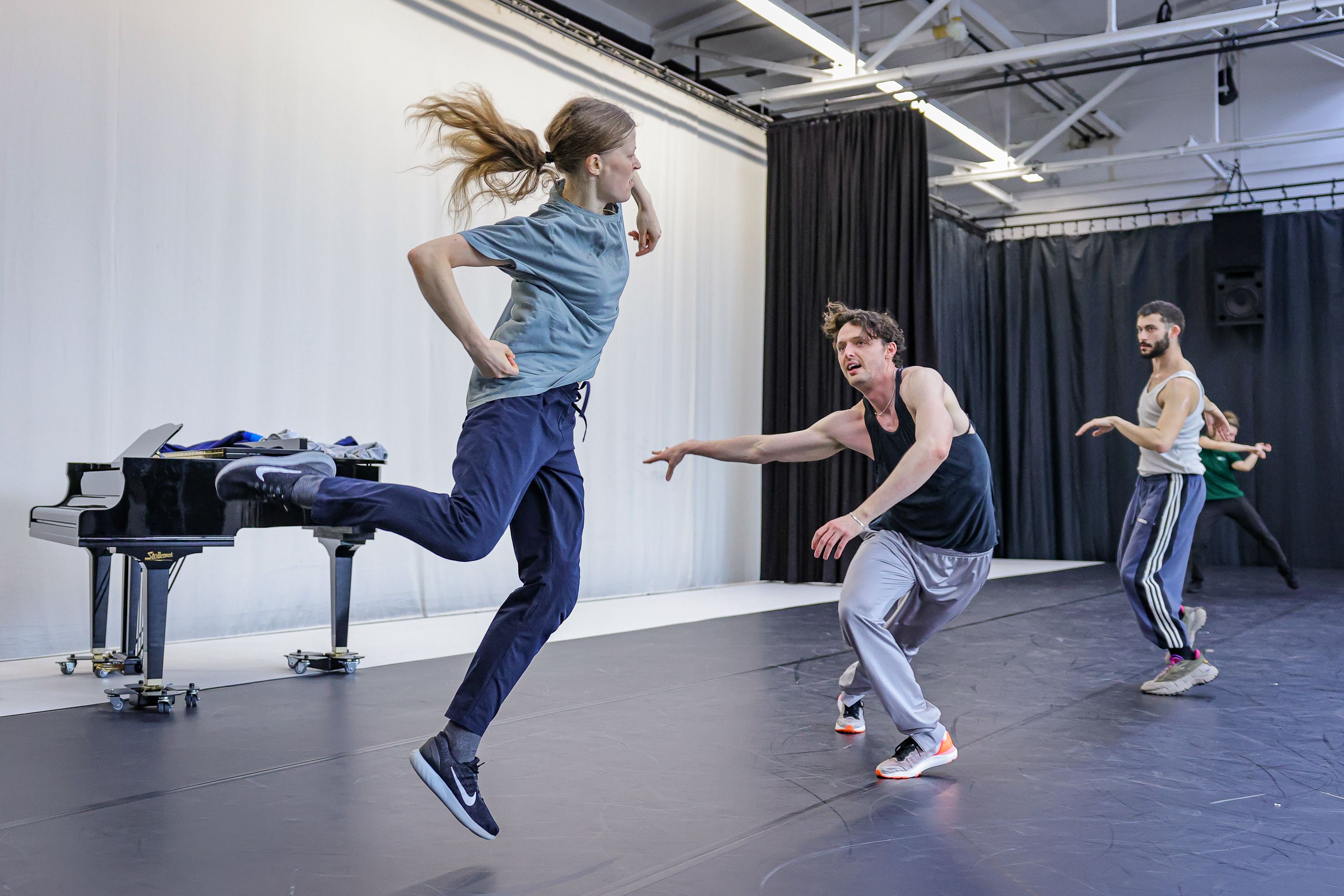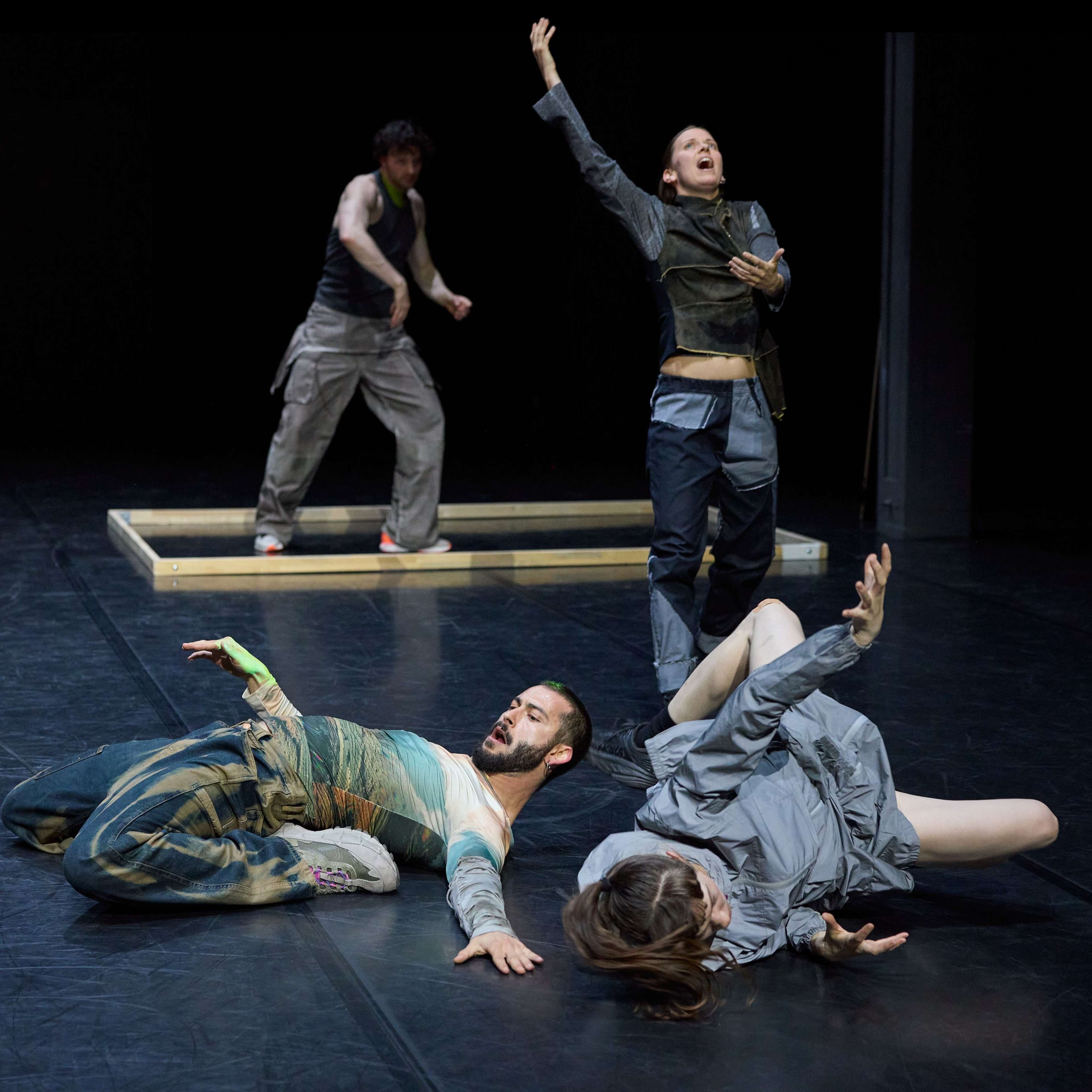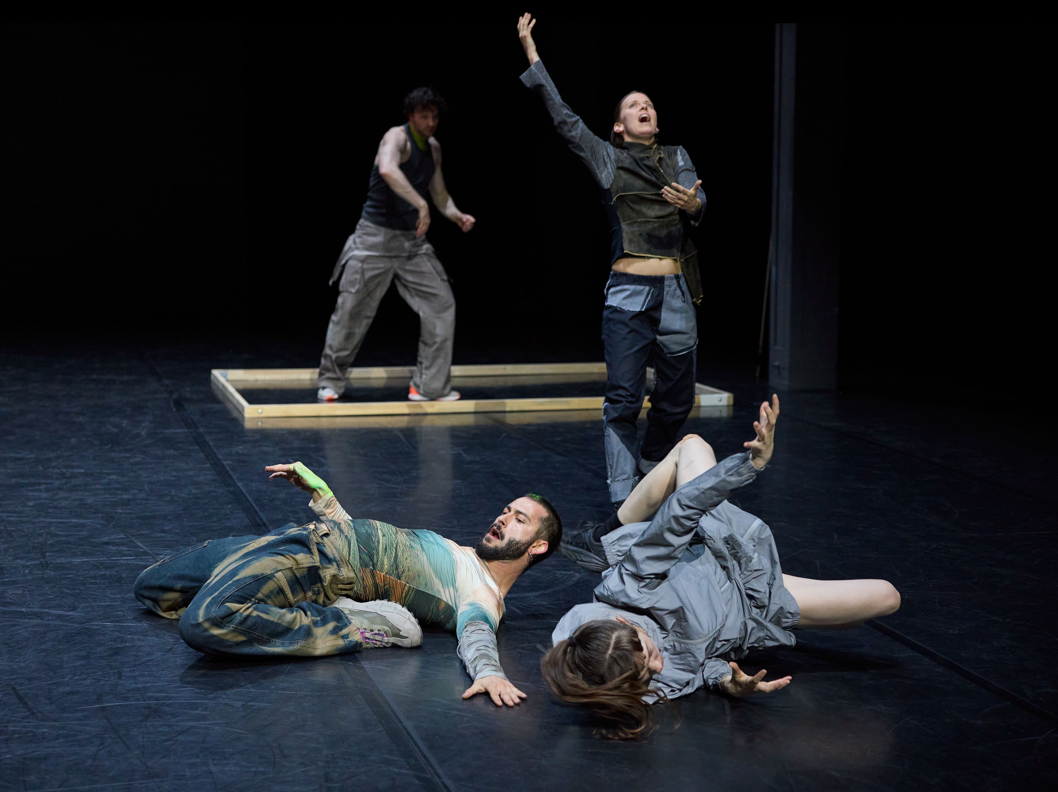 An unserem Doppelabend „Welcome“ zeigten sie ihre Stücke „Wesenwelt“ und „Warpscapes“. In „Wesenwelt“ verwandelte die norwegische Choreografin unser Ensemble in ein kollektives Musikinstrument. Sergiu Matis hinterfragte in „Warpscapes“ den Begriff der Landschaft und den Zugang von Malerei zu dieser.