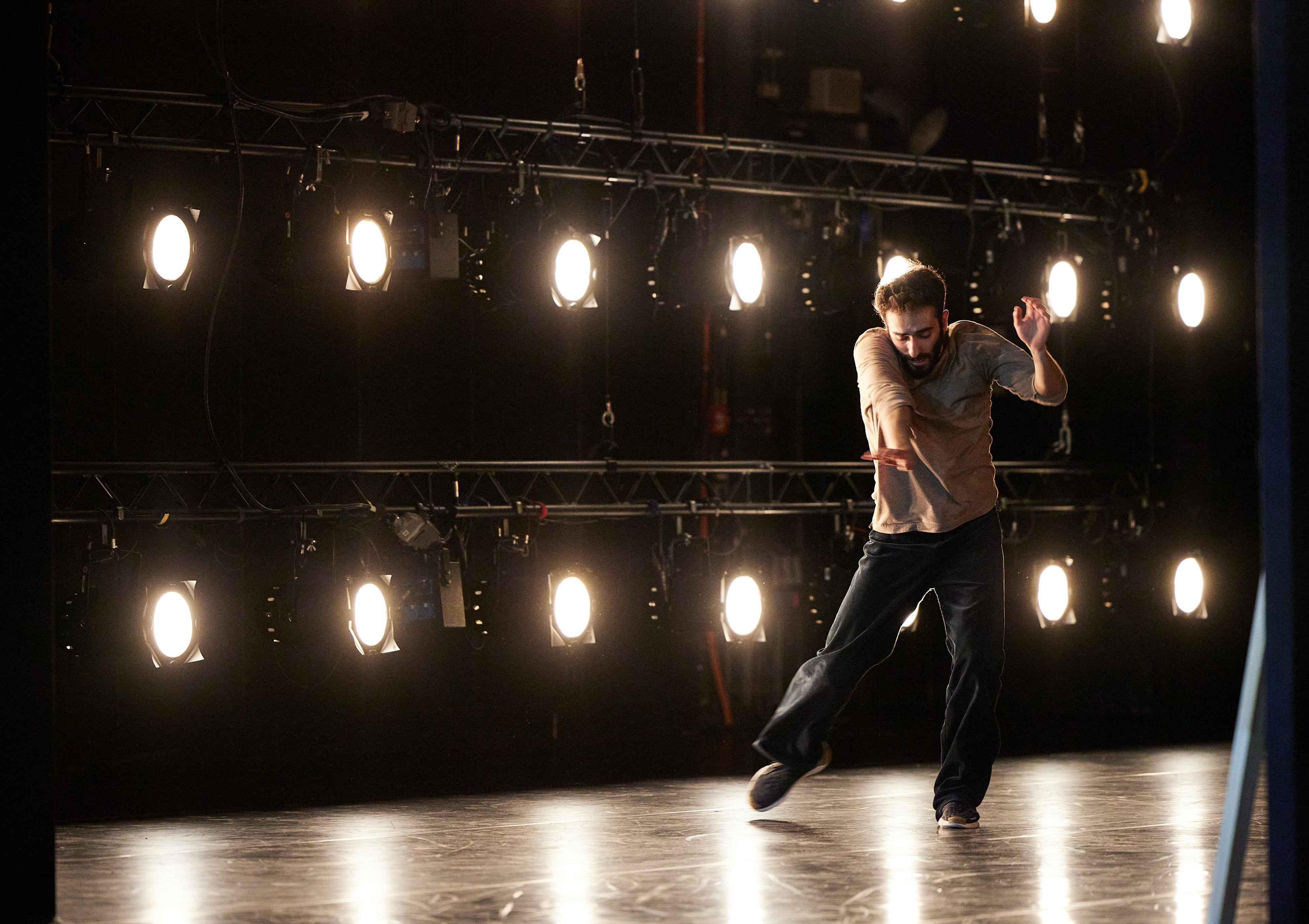 Das Stück „Bis.N.S.“ spielt mit der inneren und äußeren Welt von Künstler*innen und lotet dabei die fragile Grenze zwischen Bühne und dem Bereich hinter den Kulissen aus. So erleben die Zuschauer*innen ein Tanzstück in Aufführung und gleichzeitig durch immer wieder neue Verschiebungen, wie sich die Tänzer*innen auf ihren Auftritt vorbereiten. Sie proben ihre Bewegungen, wiederholen und korrigieren sich, als ob niemand ihnen dabei zuschaute. Kleine und große, private und künstlerische Momente reihen sich aneinander: normaler Tanzbetrieb – business as usual.